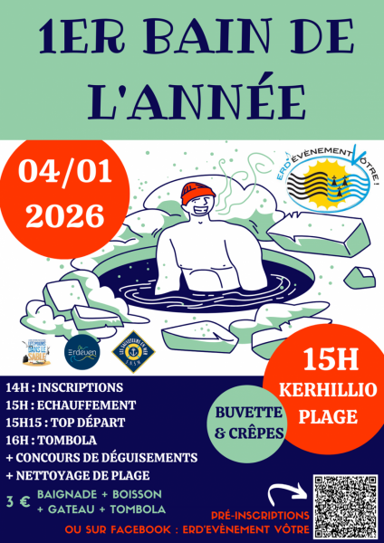 Le traditionnel 1er bain de l'année aura lieu le dimanche 04 janvier 2026 à la plade de kerhillio dès 15h00 !